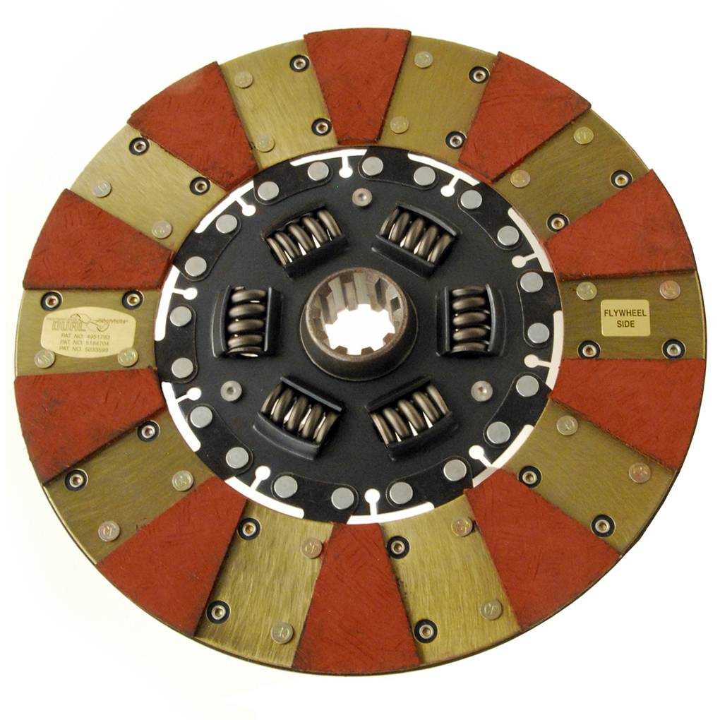 The Centerforce ® Dual Friction ® Disc Series uses a single disc with patented dual friction technology by distributing pressure plate clamp force evenly over a 360-degree friction-facing on one side of the clutch disc, while the opposing side uses a segmented friction-facing to concentrate clamping pressure and increase clutch holding-capacity. These discs are made for Centerforce Dual Friction pressure plates.